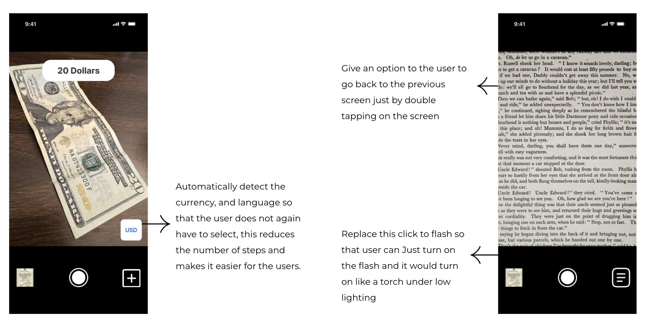 This will open the back camera, which when focused on any type of text automatically recognizes and reads the text aloud. Users also have the option to upload images and have the images' text read to them. Transcripts are also made available to users so that those who have even the smallest visual impairment and are unable to read text that is smaller in size can quickly scan it and find the bigger text.