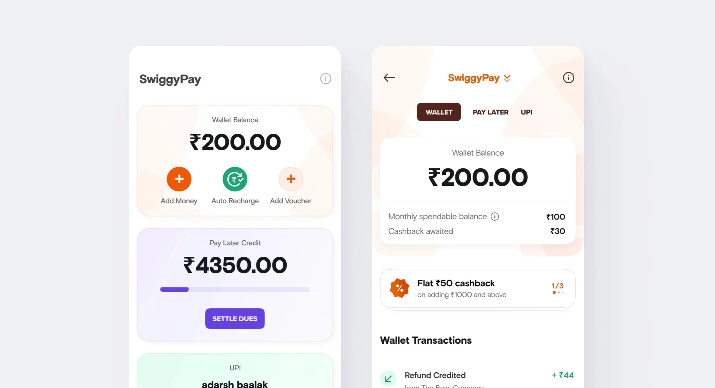 (Left) Swiggy Pay with balance combined from Wallet & Pay Later. (Right) Umbrella account management