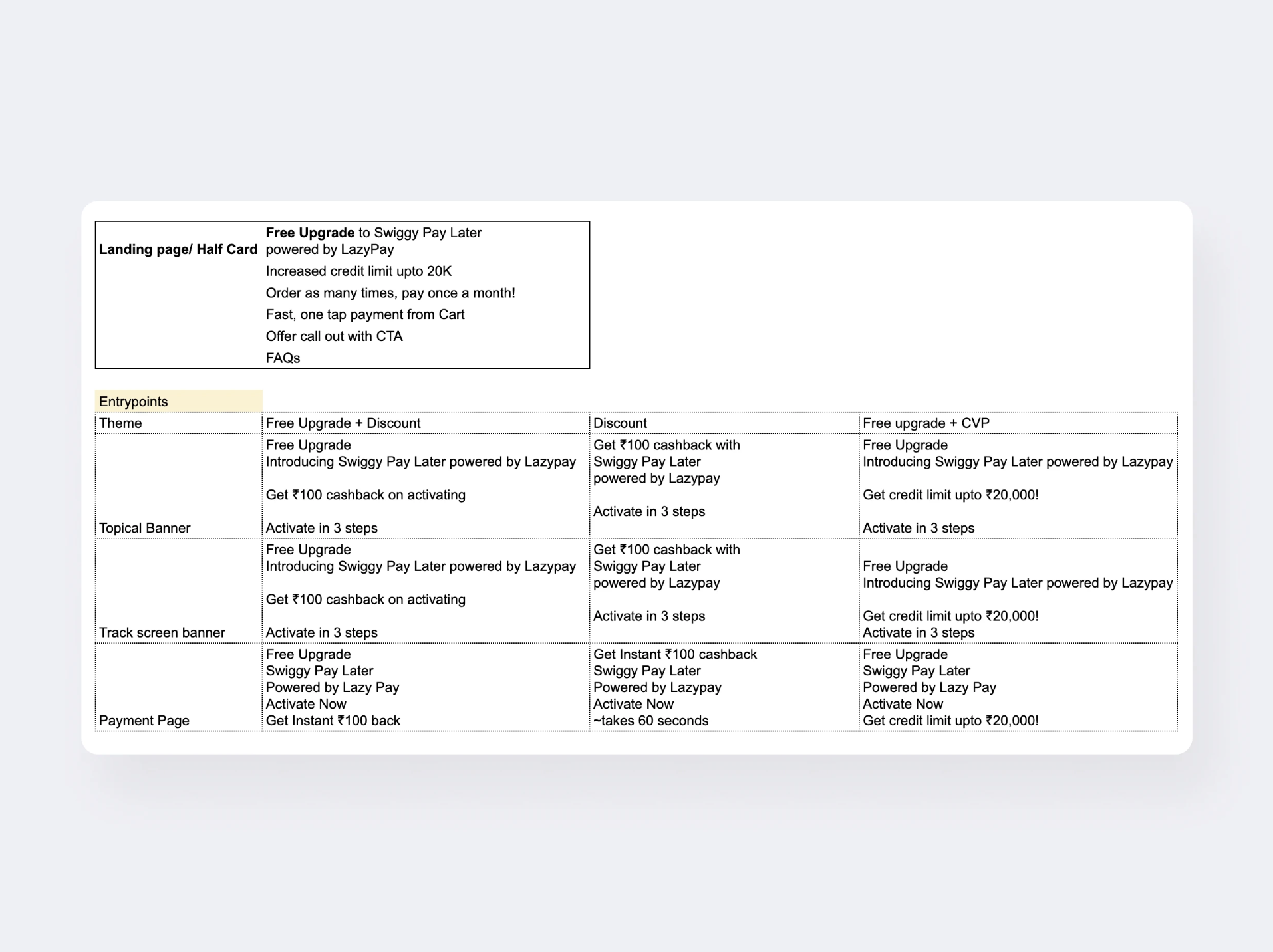 There were different cohorts of users we needed to consider. For eg people using Lazypay on other platforms, existing Lazypay users on Swiggy, new users, etc.