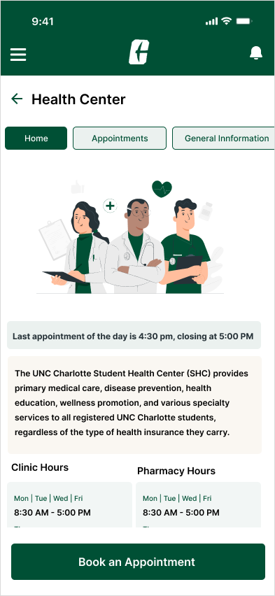 As an international student, the health center feature here is very helpful. It reminds me of a time when I was very ill and visited the SHC. I was told I was just 5 minutes late to book the last appointment of the day.